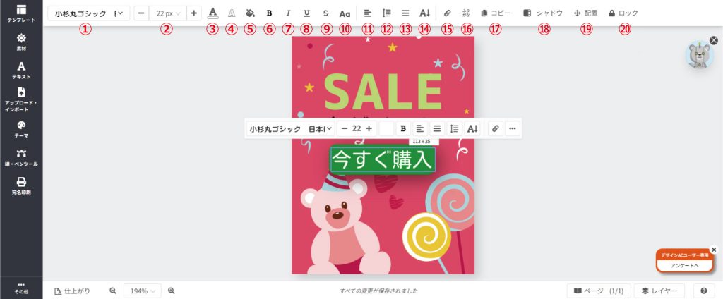 編集したいテキストを選択(青色の枠が表示された状態に)した際には、上部にツールバーが表示されます。下記画像の①~㉑は、以下のアプリケーションが利用できます。