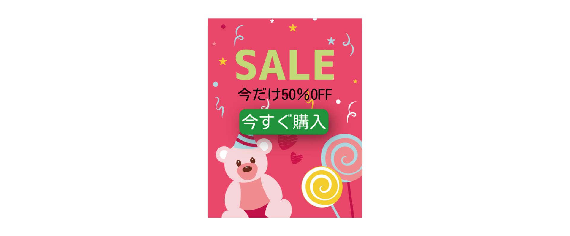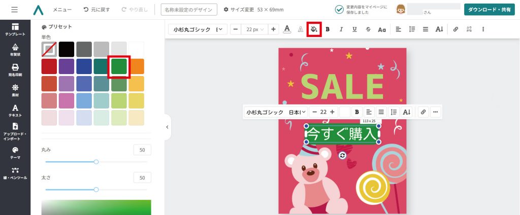例として、下記画像の「今すぐ購入」の部分は、テキストの背景色を緑色にし、文字色を白色に変更しました。