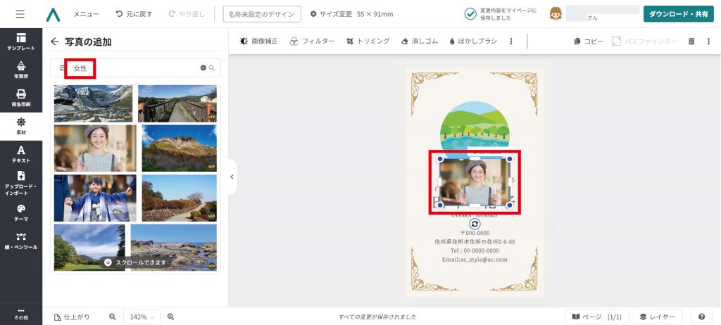 今回は名刺のサンプルとして顔写真を使⽤したいので「⼥性」と⼊⼒し、右側の⾍眼鏡マークを押して画像を検索。