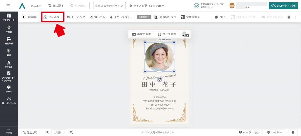 画像を選択した状態で、ツールバーから「フィルタ」をクリック。