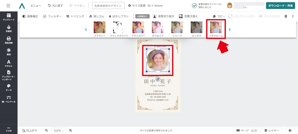 今回使⽤する「コダクローム」をクリックすると、このように写真にフィルタが反映されます。