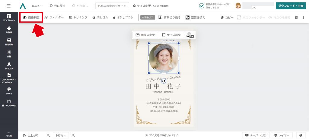 画像を選択した状態で、ツールバーから「画像補正」をクリック。