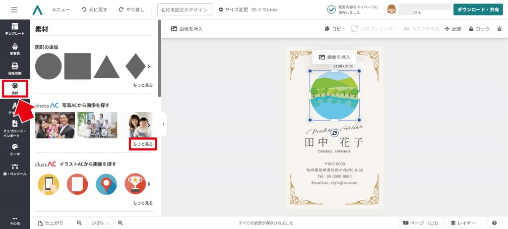 「素材」→「写真ACから画像を探す」→「もっと見る」をクリックし、使⽤したい写真を選びます。