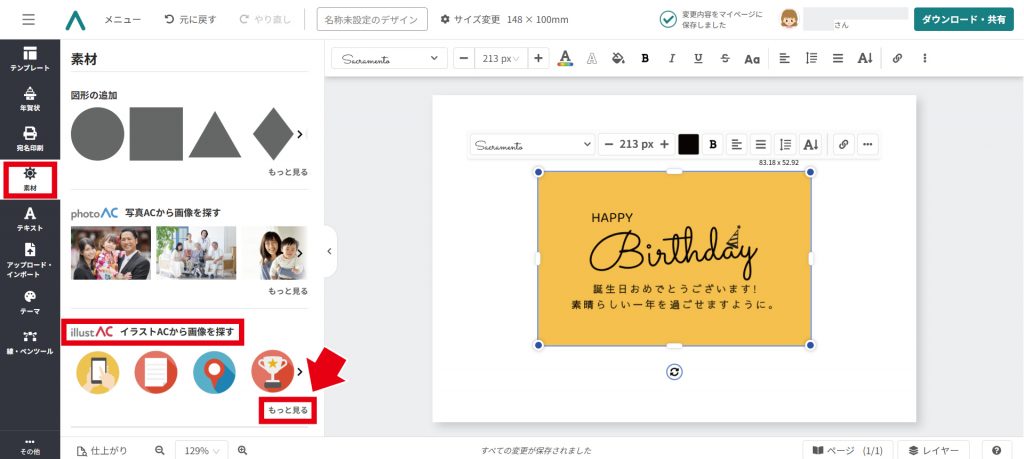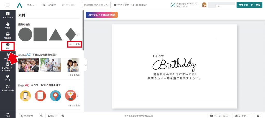 左メニューの「素材」→「イラストACから素材を探す」→「もっと見る」をクリック。