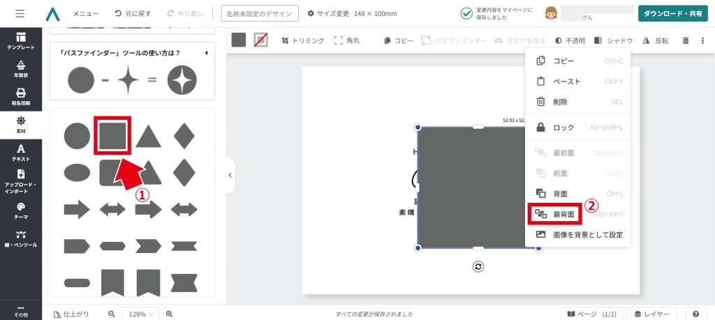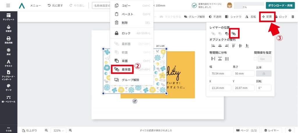 ② 素材を選択して右クリック →「最背⾯」をクリック。
