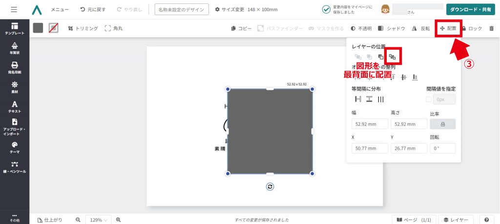 「配置」をクリックし、追加パネルを表⽰。パネル上部「レイヤーの位置」の⼀番右のマークをクリックすると、② と同じく図形を最背⾯に配置できます。