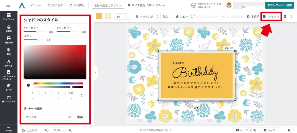 仕上げとして、ツールバーの「シャドウ」で影を追加します。