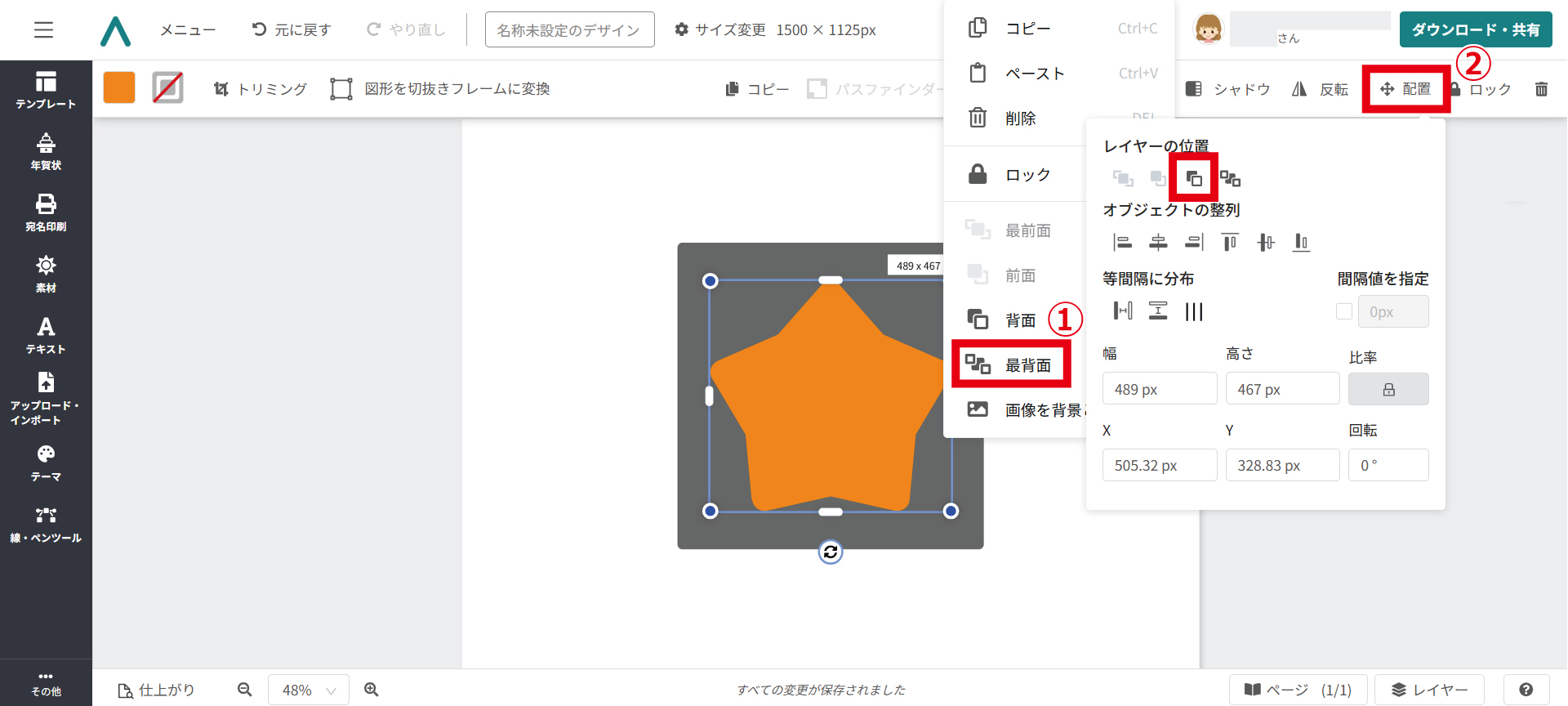 ② またはツールバーの「配置」をクリック → 配置パネルの「レイヤーの位置」から「背面」をクリック