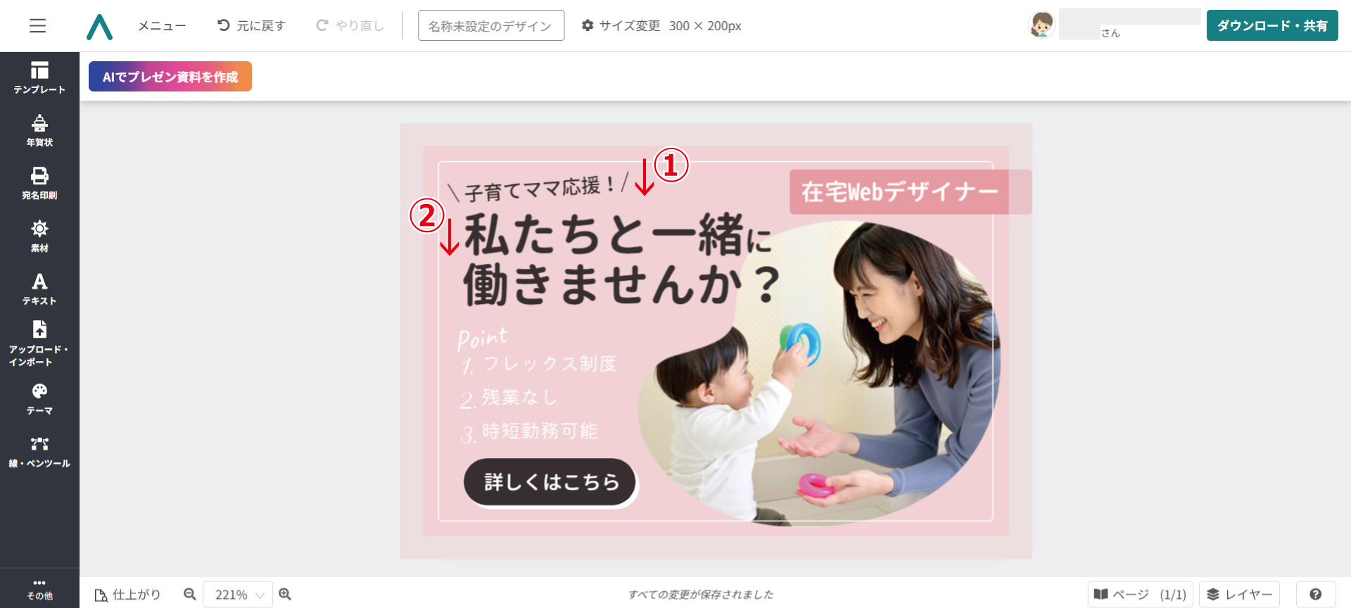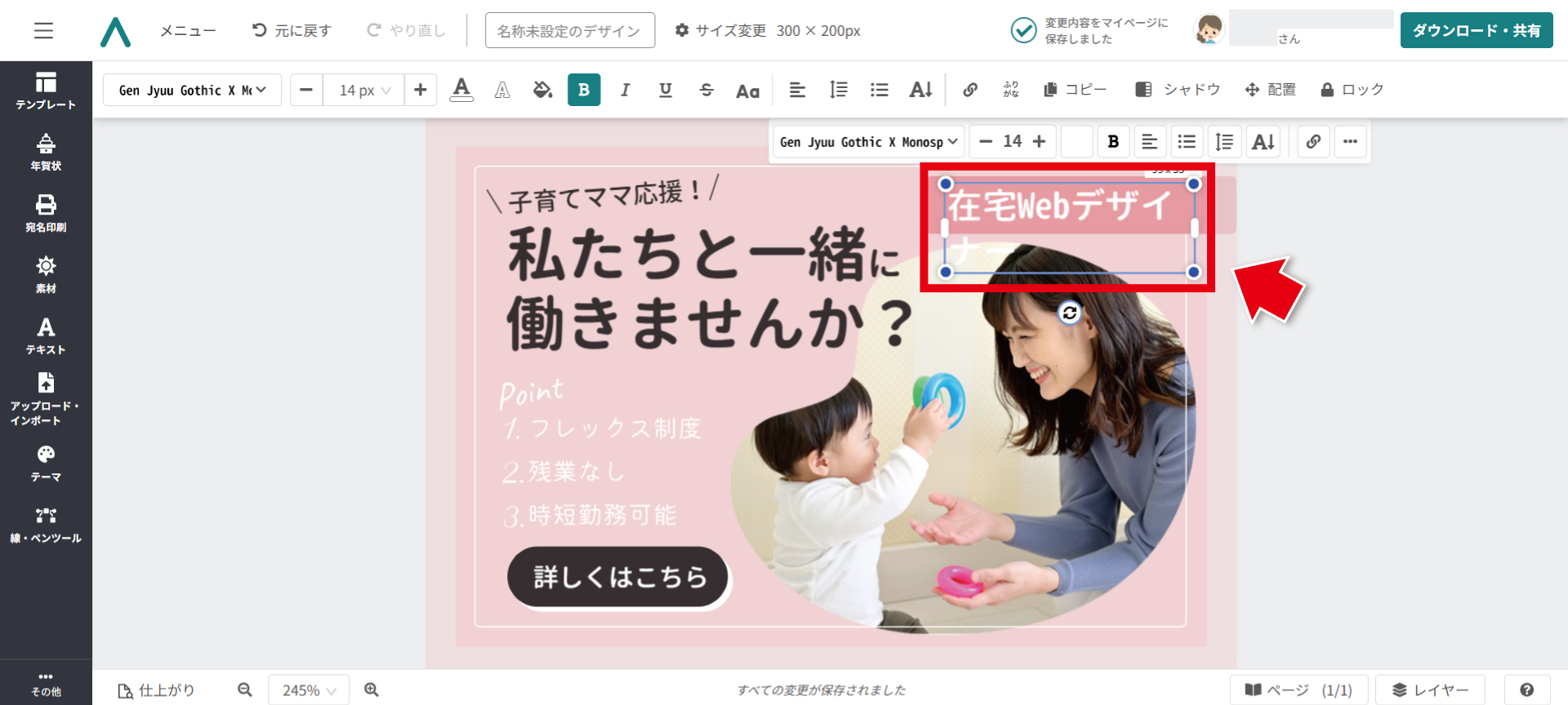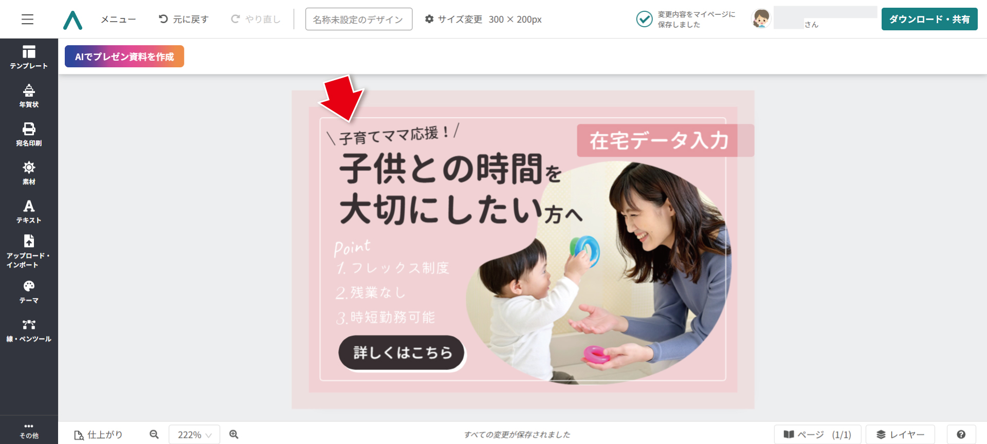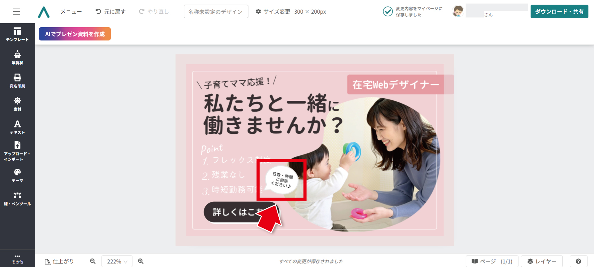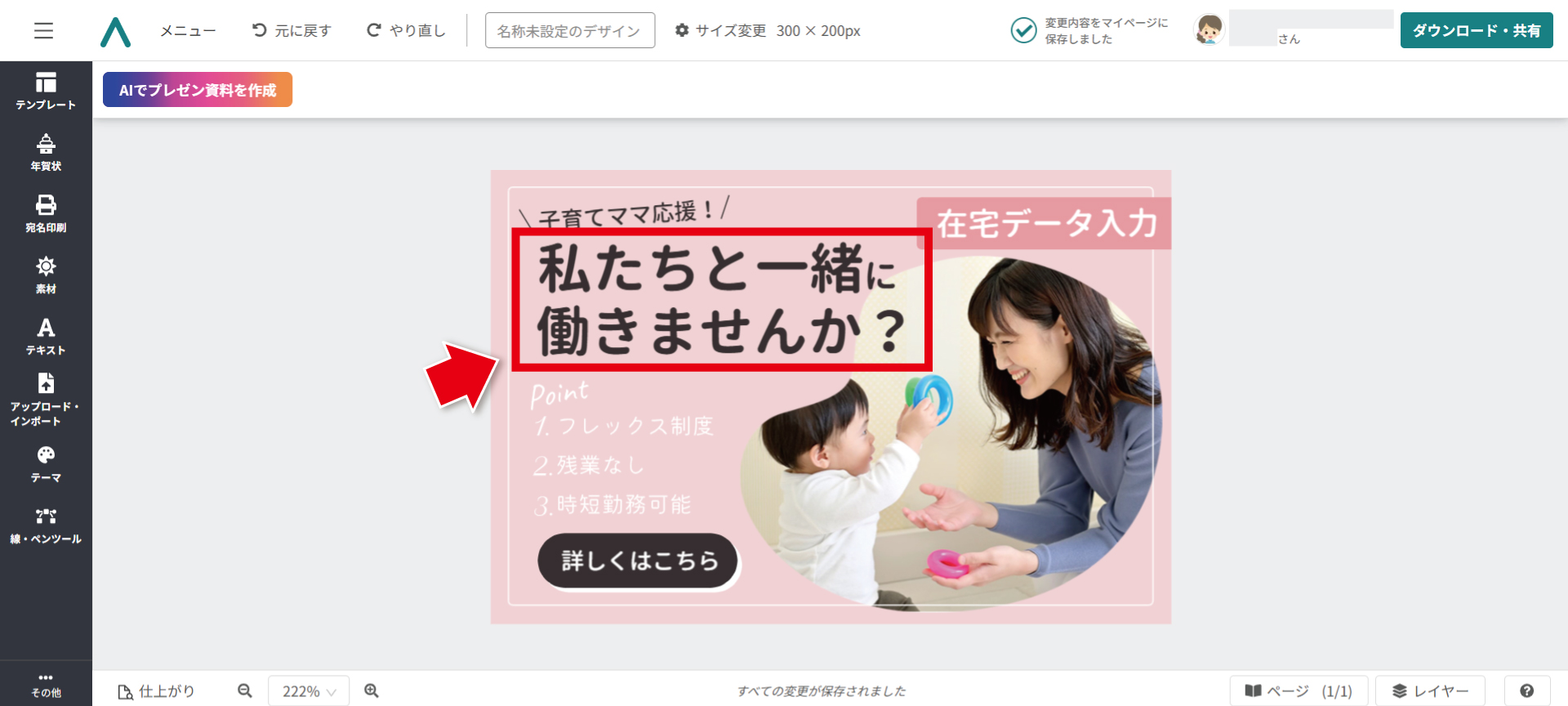 まず「もっと」のテキストをクリックし、文字を消して「子育てママ応援!」と入力。文字の幅に合わせて、斜め線も移動します。