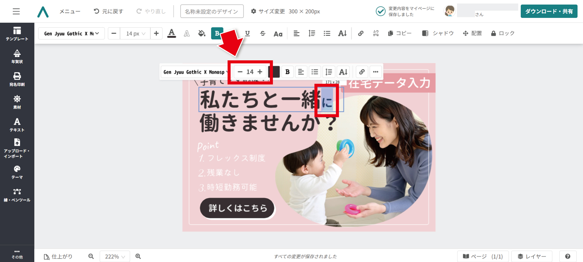 文中の一部分だけ文字サイズを変えるには、該当の文字を選択してから、表示されるツールバーでサイズを調整するだけ。とても簡単です。