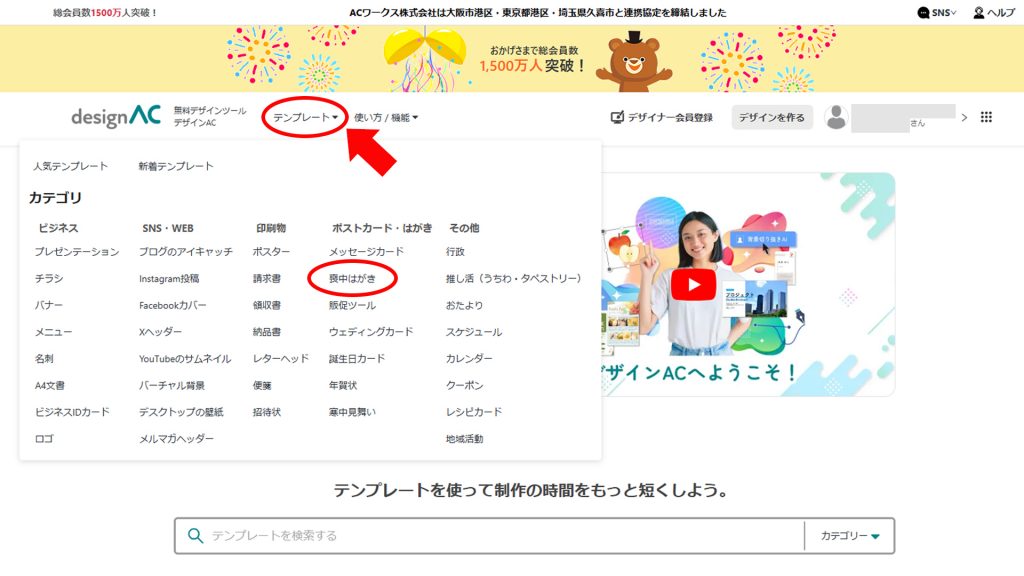 デザインACのトップページの「テンプレート」ボタンを押すとカテゴリ一覧が表示されるので、「喪中はがき」を選択します。