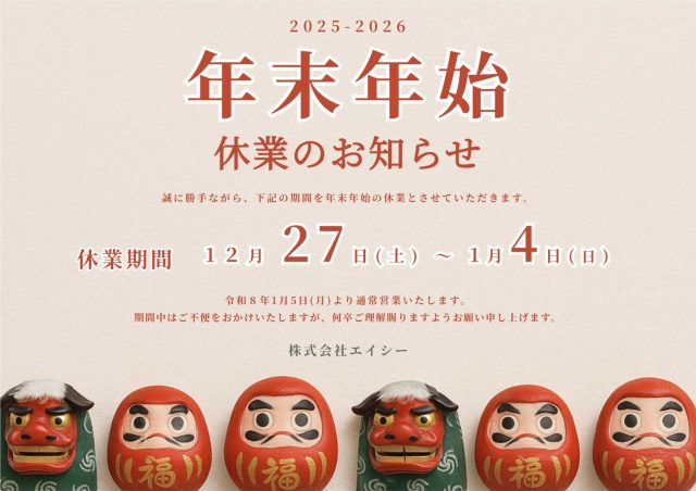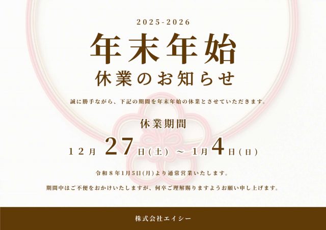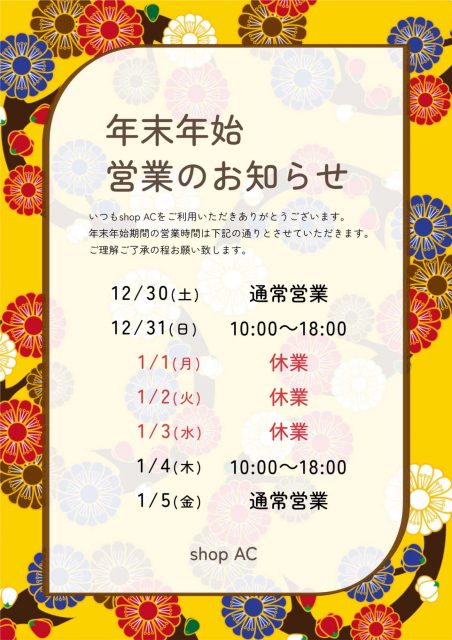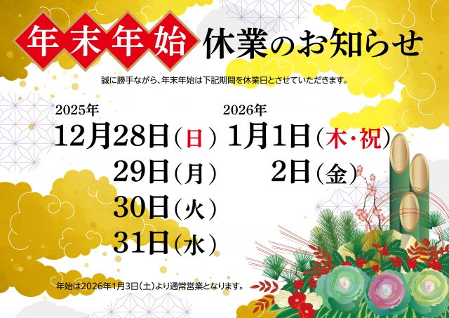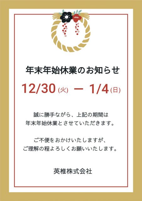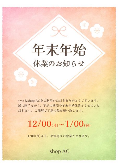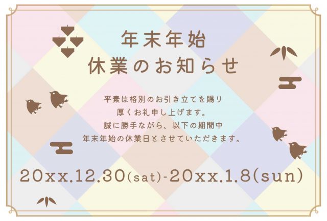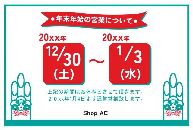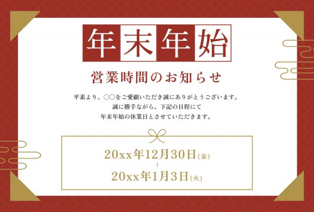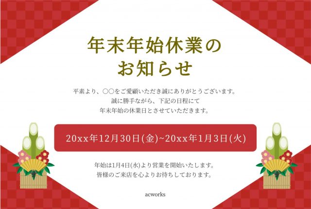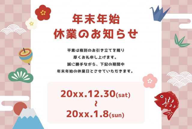 季節感のあるデザインで、お客様の目にもぱっと入りやすく、年末年始の休業情報をしっかりお知らせできます。