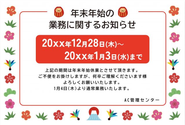 「デザインAC」や「イラストAC」の素材を使えば、誰でも簡単におしゃれでわかりやすい年末年始の休業案内が作れます。