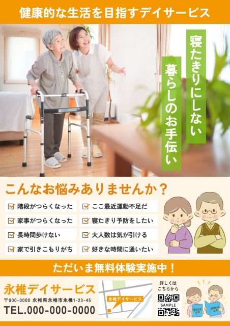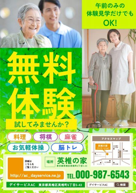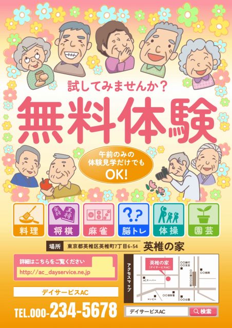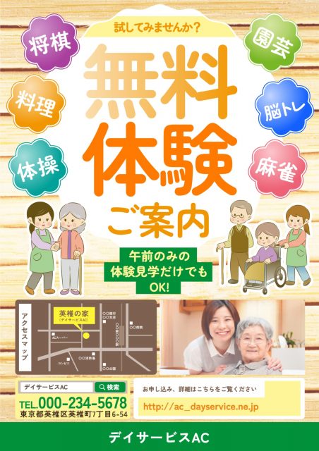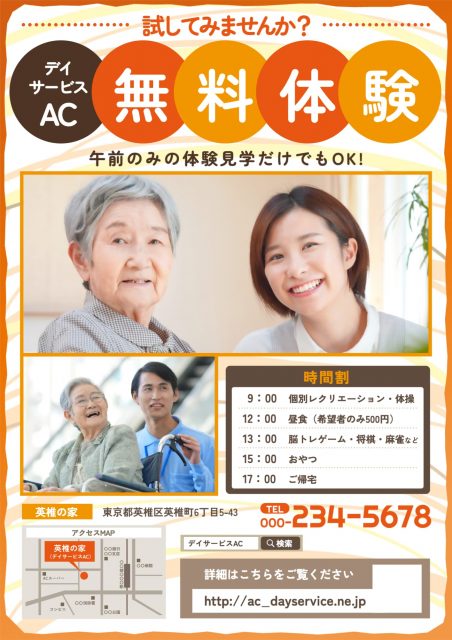 デザインAC には、無料でお使いいだける「デイサービス向けのチラシテンプレート」を豊富に公開しています。