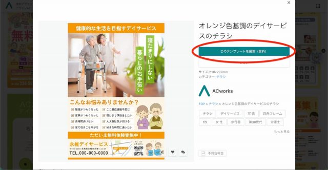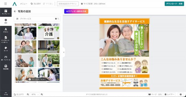 デザインAC を使えば、デザイン初心者でも簡単にデイサービス向けチラシが作れます。