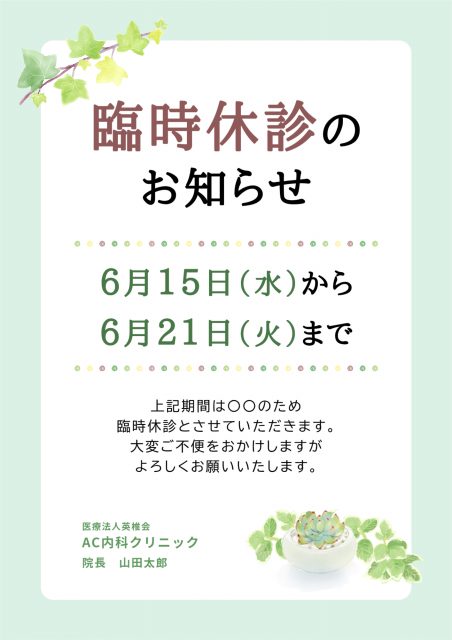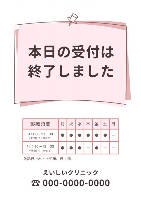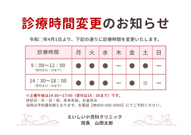 続いては、診療時間の変更や臨時休診など、来院前に確認しておきたい情報を伝える掲示デザインをピックアップしました。