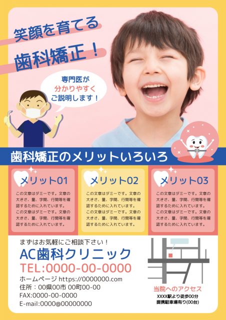文字の配置やイラストなど基本のデザインが整っているため、サッと編集するだけで、歯科医院向けのポスターやチラシを手軽に作成できます。
