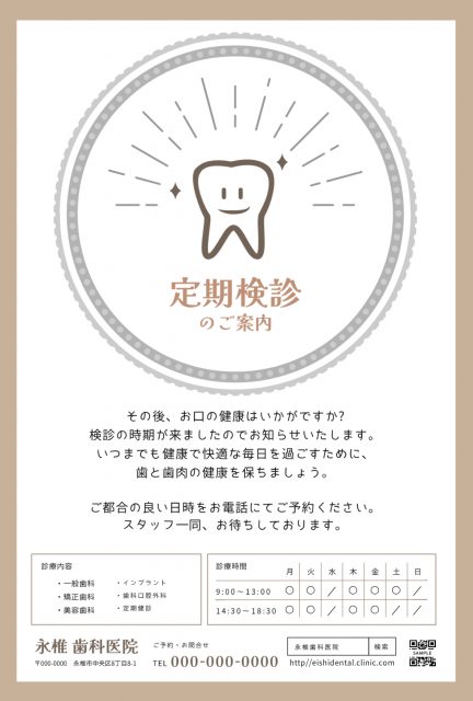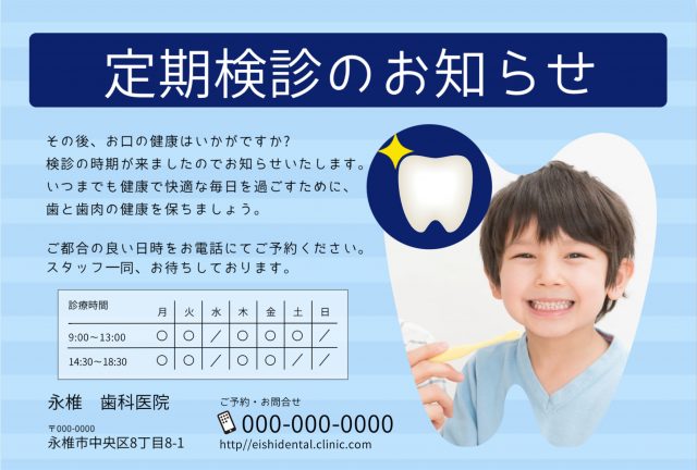 まずは、歯科医院の基本ともいえる歯科検診の案内からご紹介します。