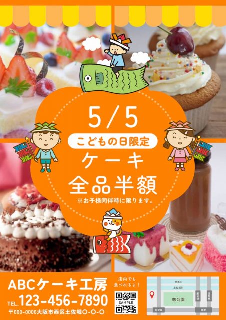 ケーキ屋さん向けの元気なこどもの日のチラシ