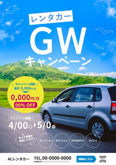 白抜き文字が目立つ爽やかなレンタカーキャンペーンポスター