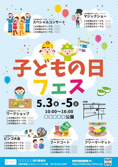 水色ドット背景にこどもの日フェスのイベントのイラストが並んだチラシ