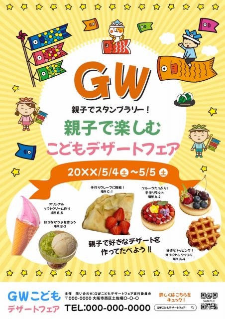 黄色と白の背景に鯉のぼりと子どもたちのイラストとスイーツの写真のゴールデンウィークの子どもデザートフェアのポスター