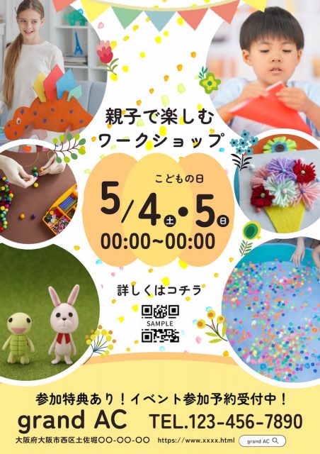優しい色合いの背景に丸い写真のこどもの日の親子ワークショップのポスター
