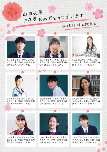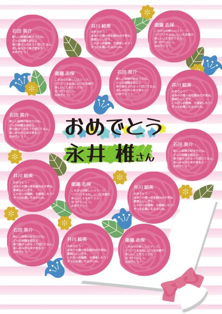 パステルカラーの花が春らしくファンシーなデザインの寄せ書きフレーム。中央欄には日付などを入れてどんな寄せ書きか強調しても良いでしょう。