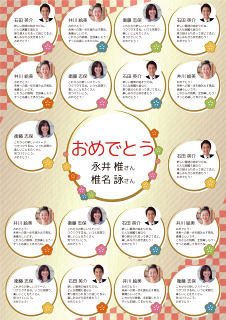結婚などのお祝いにぴったりなデザインテンプレート。10人以上のメッセージを載せられるようになっていて、写真の編集も可能です。