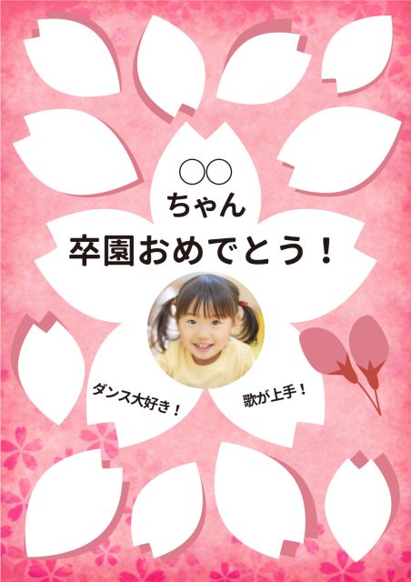 卒園や卒業の寄せ書きにピッタリな桜の花びらのデザインテンプレート。写真下のメッセージのように、贈る相手の褒めポイントを書いても良いですね。