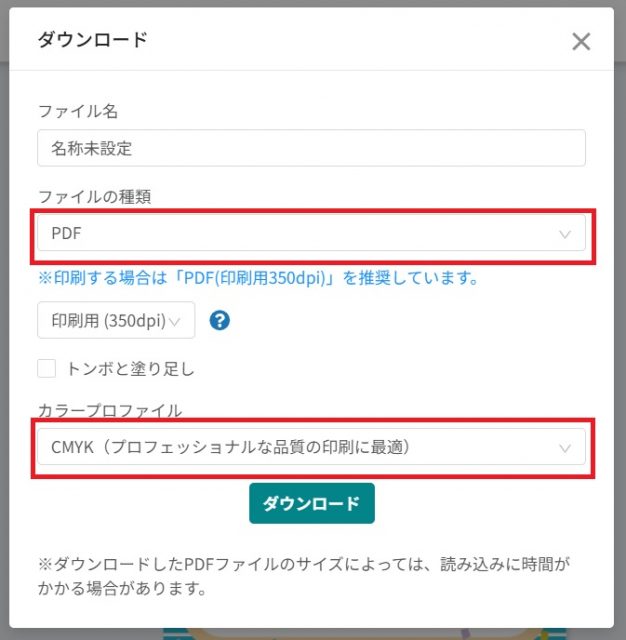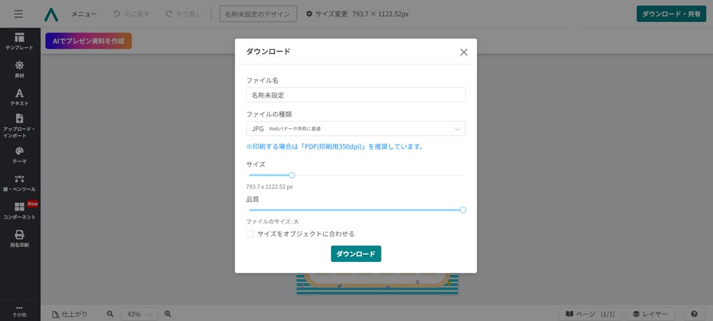 編集画面右上の「ダウンロード・共有」ボタンから「ダウンロード」を選ぶと、設定項目のウィンドウが開きます。