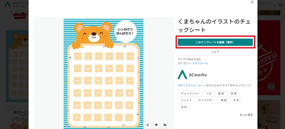 使いたいテンプレートを選んでクリックすると、別ウィンドウで大きく表示されます。「このテンプレートを編集(無料)」のボタンをクリックします。