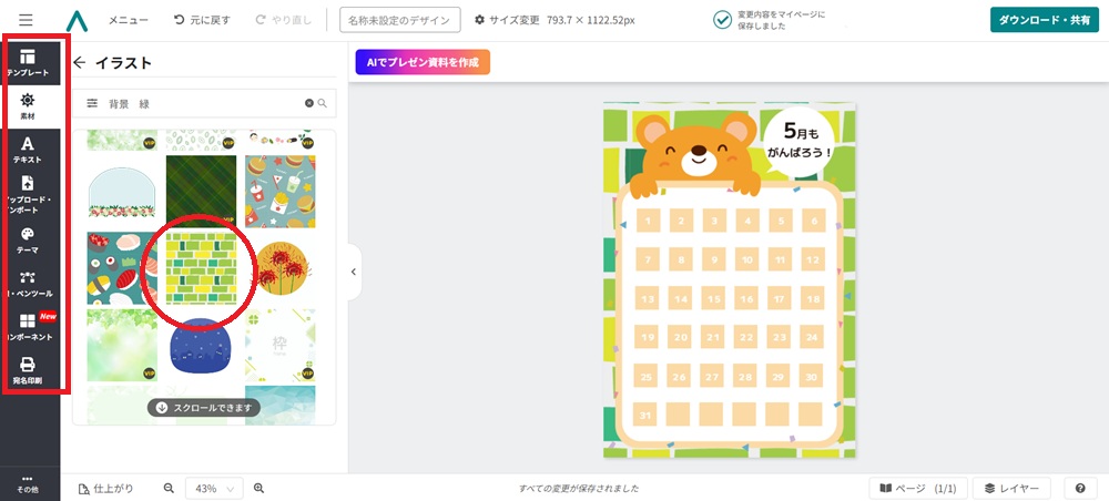 左端のツールバーからも背景やイラスト、文字などのアレンジが可能です。