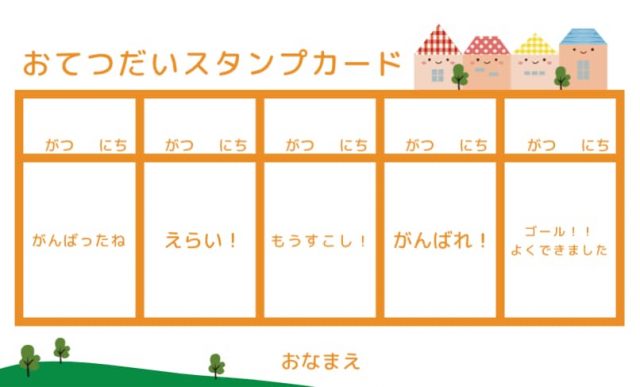 お手伝いした日にちを書き込めるスタンプカードです。回数ごとに応援メッセージがあるのが嬉しいですね。