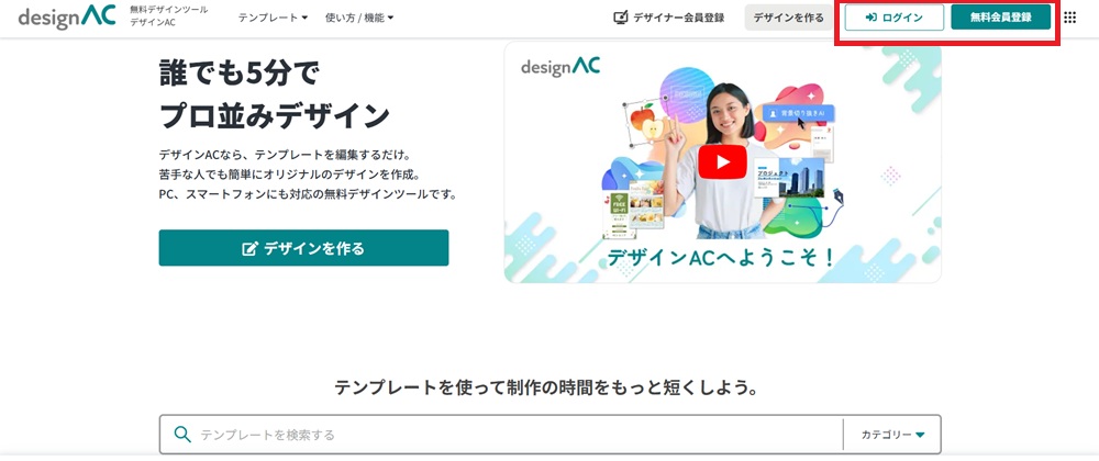 まずはデザインACのトップページからログインしましょう。アカウントを持っていない方は、右上のボタンから無料で会員登録できます。