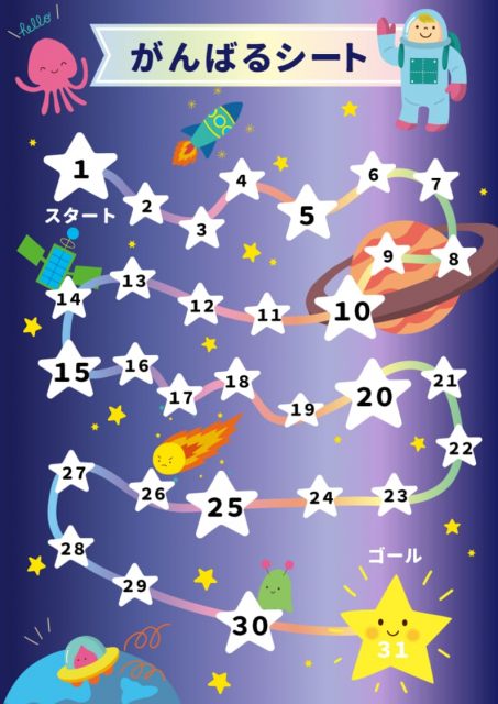 すごろくのようになっているスタンプシート。5つごとに大きな星がついているので、達成感も得られます。