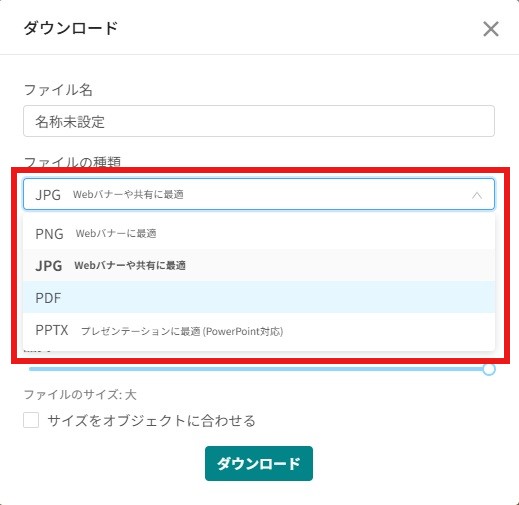 画面右上の「ダウンロード・共有」ボタンをクリックすると、「ダウンロード」「共有」「SNS共有」と3つのボタンが表示されるので、「ダウンロード」をクリックします。