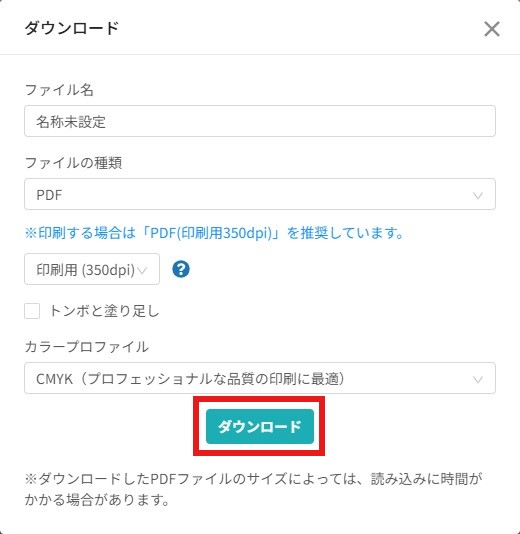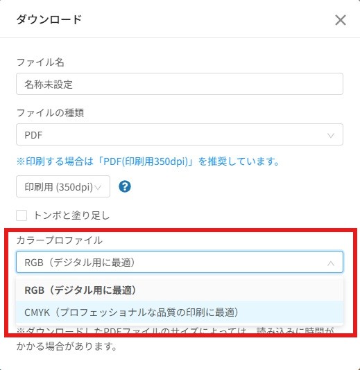 「カラープロファイル」には「CMYK(プロフェッショナルな品質の印刷に最適)」を選びましょう。