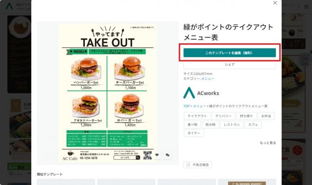 テイクアウトメニュー用のテンプレートを検索する