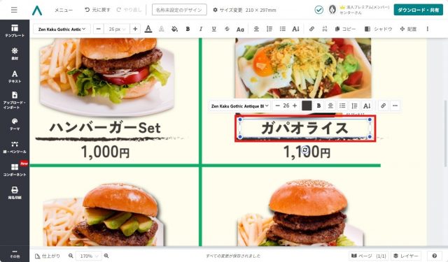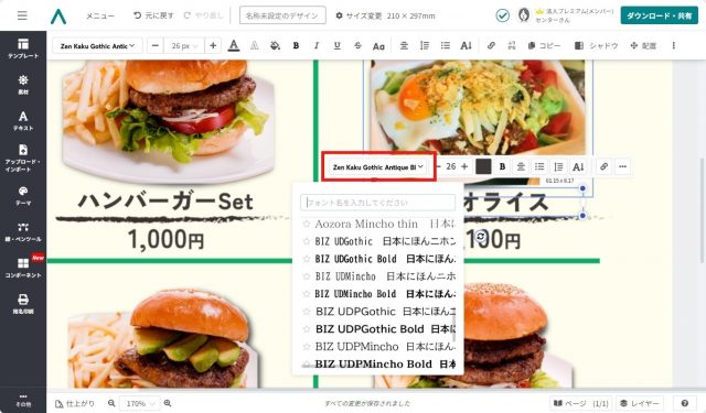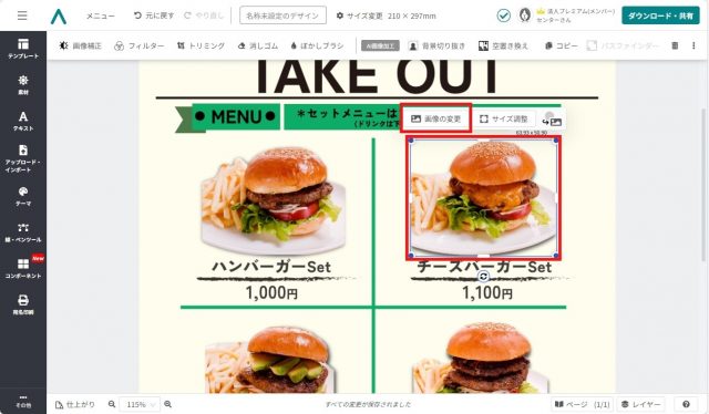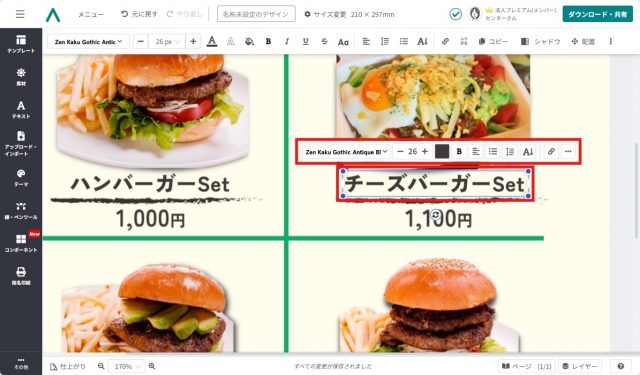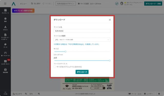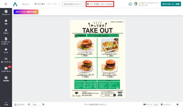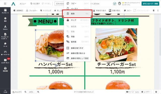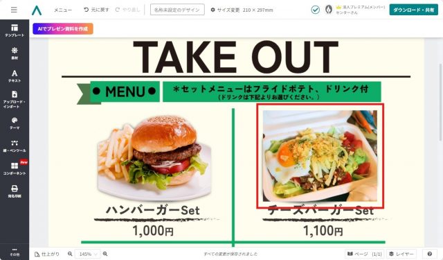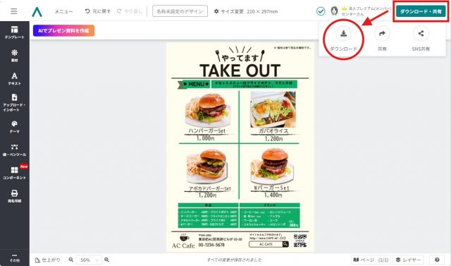 編集が終了したら、作成したテイクアウトメニューをダウンロードしましょう。
