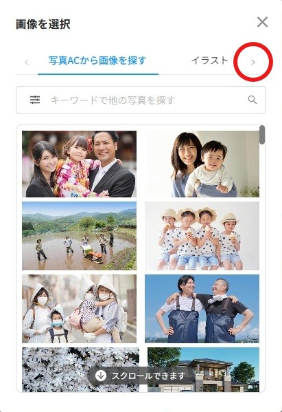 「写真ACから画像を探す」を選択すれば姉妹サイト「写真AC」の素材が、「イラスト」を選択すれば姉妹サイト「イラストAC」の素材が使用できます。