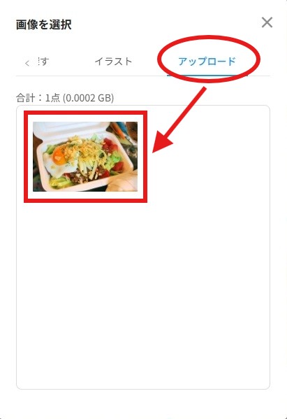 「アップロード」の項目が表示されますので、先ほどアップロードした写真をクリックすると…