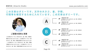 白背景に紺色の三角形のポイントと黒いラインのはいったプレゼンテーションテンプレート