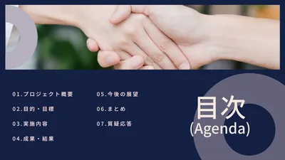 紺色背景に握手するスーツの男性の写真のプレゼンテーションテンプレート
