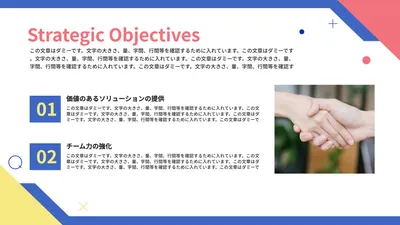 円形装飾とネイビーカラーのビジネスプレゼン資料