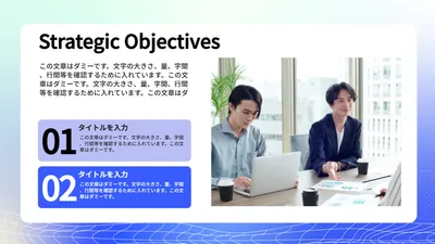 円形装飾とネイビーカラーのビジネスプレゼン資料