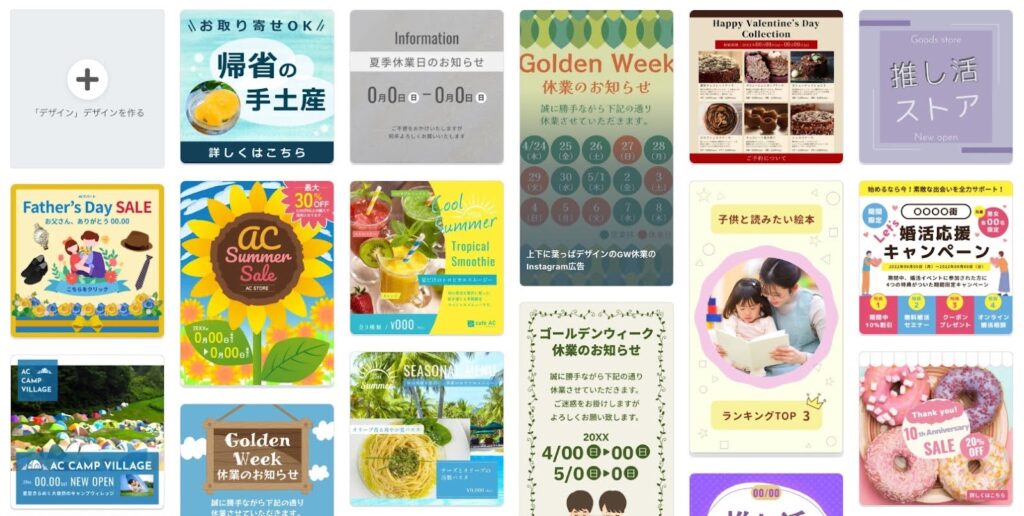 TwitterやInstagramなどのSNS投稿画像は、視覚的にブランドイメージを伝える上で非常に重要です。デザインACには、SNS投稿に最適なサイズのテンプレートが多数用意されています。