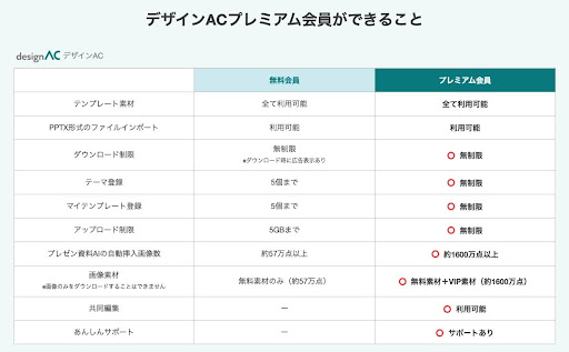 デザインACは無料でも高品質な素材とテンプレートが使え、作成したデザインの商用利用も可能です。ただし、無料版ではダウンロード数に制限があったり、「VIP素材」という一部の素材は利用できません。